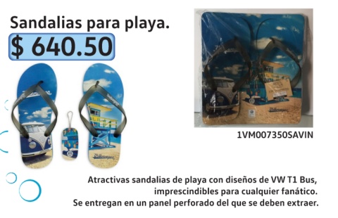 Sandalias para playa. $ 640.50 1VM007350SAVIN Atractivas sandalias de playa con diseños de VW T1 Bus, imprescindibles para cualquier fanático. Se entregan en un panel perforado del que se deben extraer.