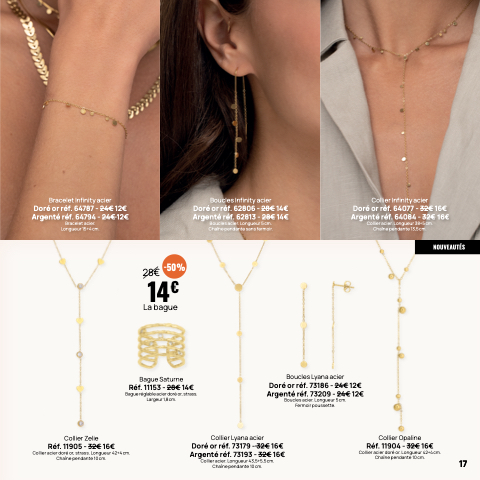 Collier acier doré or, strass. Longueur 42+4 cm.