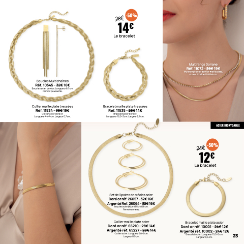 Multirangs acier doré or maille plate,
