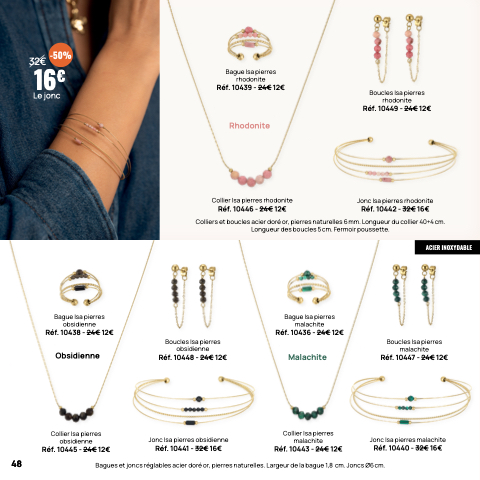 Bagues et joncs réglables acier doré or, pierres naturelles. Largeur de la bague 1,8 cm. Joncs Ø6 cm.