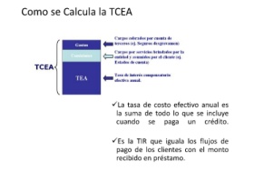 Como se Calcula la TCEA La tasa de costo efectivo anual es la suma de todo lo que se incluye cuando se paga un crédito. Es la TIR que iguala los flujos de pago de los clientes con el monto recibido en préstamo.