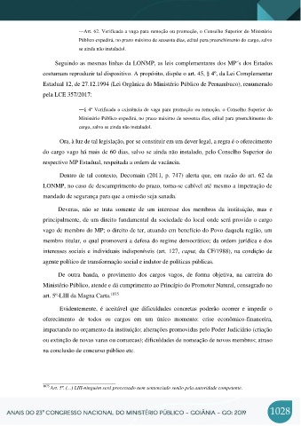 ―Art. 62. Verificada a vaga para remoção ou promoção, o Conselho Superior do Ministério