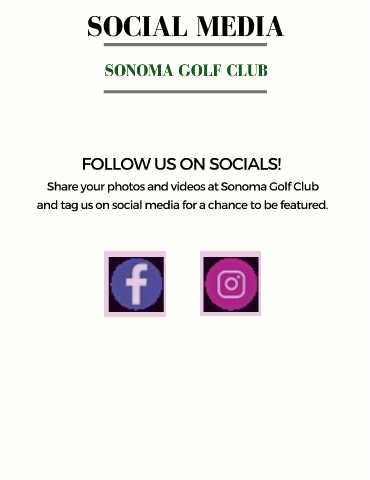SOCIAL MEDIA SONOMA GOLF CLUB FOLLOW US ON SOCIALS! Share your photos and videos at Sonoma Golf Club and tag us on social media for a chance to be featured.