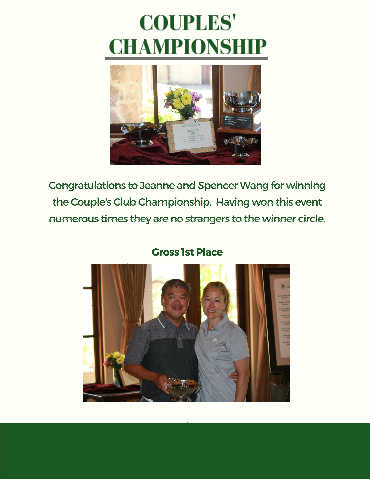 COUPLES' CHAMPIONSHIP Congratulations to Jeanne and Spencer Wang for winning the Couple's Club Championship. Having won this event numerous times they are no strangers to the winner circle. Gross 1st Place Spencer & Jeanne Wang ,