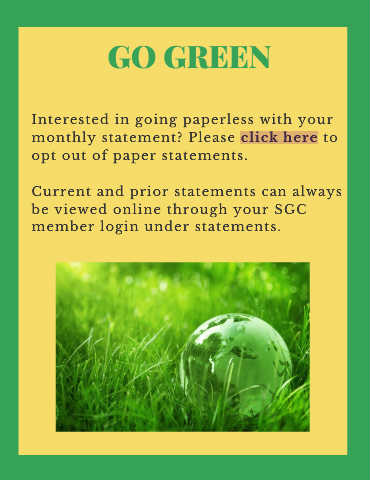 GO GREEN Interested in going paperless with your monthly statement? Please click here to opt out of paper statements. Current and prior statements can always be viewed online through your SGC member login under statements.