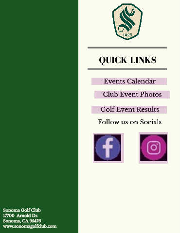 QUICK LINKS Events Calendar Club Event Photos Golf Event Results Follow us on Socials Sonoma Golf Club 17700 Arnold Dr. Sonoma, CA 95476 www.sonomagolfclub.com