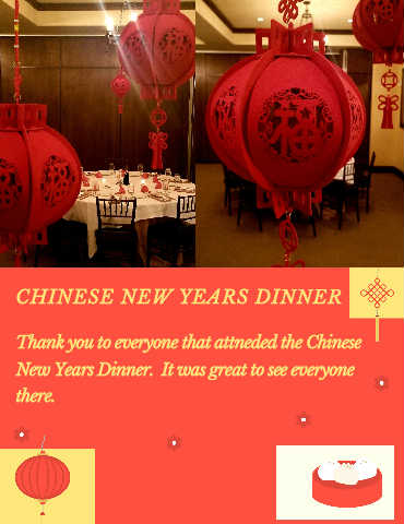 CHINESE NEW YEARS DINNER Thank you to everyone that attneded the Chinese New Years Dinner. It was great to see everyone there.