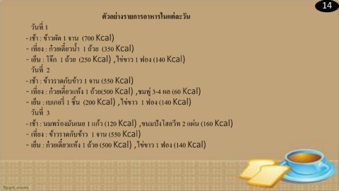 - เย็น : เบเกอรี่ 1 ชิ้น (200 Kcal) ,ไข่ขาว 1 ฟอง (140 Kcal)