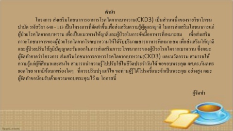 ผู้จัดทําคาดว่าโครงการ ส่งเสริมโภชนาการอาหารโรคไตจากเบาหวาน(CKD3) และนวัตกรรม สามารถให้