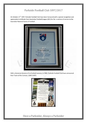 On October 17 1997, Parkside Football Club have been honoured with a special recognition and