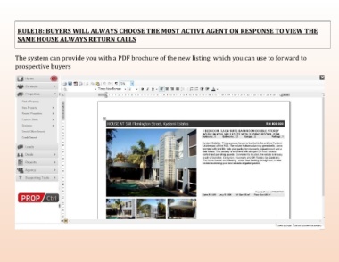 RULE18: BUYERS WILL ALWAYS CHOOSE THE MOST ACTIVE AGENT ON RESPONSE TO VIEW THE SAME HOUSE ALWAYS RETURN CALLS The system can provide you with a PDF brochure of the new listing, which you can use to forward to prospective buyers