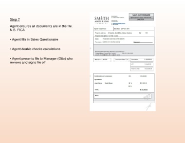 Step 7 Agent ensures all documents are in the file. N.B. FICA • Agent fills in Sales Questionaire • Agent double checks calculations • Agent presents file to Manager (Otto) who reviews and signs file off
