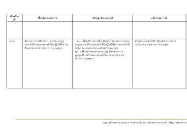 เปEาหมาย หนHวยงานที่ งบประมาณ กิจกรรม/ขั้นตอนการดําเนินงาน ตัวชี้วัด รับผิดชอบ 5. ส4งรายชื่อผู+มีสิทธิ์เข+ารับการ อบรมให+ราชวิทยาลัยฯ 6. ประสานงานจัดการอบรมทั้ง บริหารการจัดการและวิชาการ 7.สรุปผลการจัดการอบรม สํานักงาน 494,000 1. จัดทํากรอบแนวทางการ - จํานวนรายงานการวิจัย ปลัดกระทรวง ดําเนินการโครงการวิจัยฯ