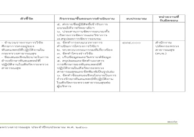 กิจกรรม/ขั้นตอนการดําเนินงาน 5. ส4งรายชื่อผู+มีสิทธิ์เข+ารับการ อบรมให+ราชวิทยาลัยฯ 6. ประสานงานจัดการอบรมทั้ง บริหารการจัดการและวิชาการ 7.สรุปผลการจัดการอบรม 1. จัดทํากรอบแนวทางการ ดําเนินการโครงการวิจัยฯ 2. ทบทวนวรรณกรรมที่เกี่ยวข+อง 3. จัดทําโครงร4างวิจัย 4. เก็บข+อมูลและวิเคราะหJข+อมูล 5. สรุปผลและจัดทําเอกสาร