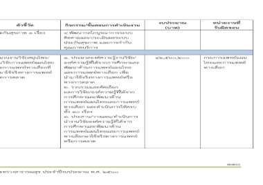 กิจกรรม/ขั้นตอนการดําเนินงาน 4.พัฒนากลไกบูรณาการระบบ ติดตามและประเมินผลระบบ ประกันสุขภาพ และการกํากับ คุณภาพบริการ ๑. ประมวลองคAความรู2งานวิจัย/ องคAความรู2ที่ได2จากการศึกษาและ พัฒนาด2านการแพทยAแผนไทย และการแพทยAทางเลือก เพื่อ นํามาใช2จริงทางการแพทยAหรือ ทางการตลาด ๒. รวบรวมและคัดเลือก ผลการวิจัย/องคAความรู2ที่ได2