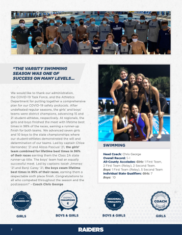 of their races earning them the Class 2A state runner-up title. The boys’ team had an equally successful meet. Led by captains Isaiah Jimenez ‘21 and Benji Carey ‘21, the boys swam lifetime best times in 95% of their races, earning them a respectable sixth place finish. Congratulations to all who competed throughout the season and the postseason!” - Coach Chris George