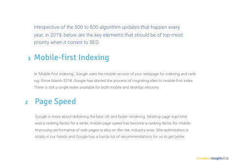 2 1 Irrespective of the 500 to 600 algorithm updates that happen every year in 2019 below are the key elements that should be be of top-most priority when it it comes to SEO Mobile-first Indexing