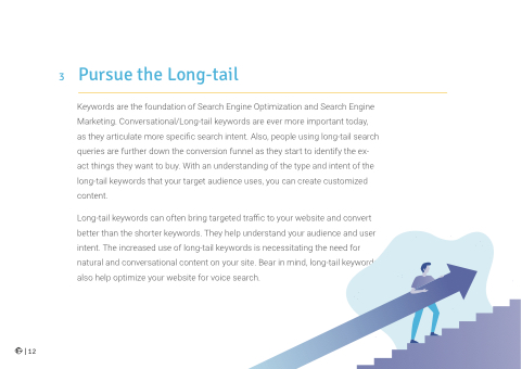 keywords can often bring targeted traffic to your website and convert better than the shorter keywords They help understand your audience and and user intent The increased use of long-tail keywords is necessitating the need for natural and conversational content on on on on on your site Bear in in mind long-tail keywords also help optimize your website for voice search | 12