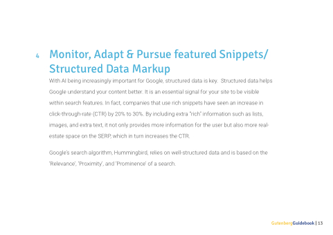 With AI being increasingly important for Google structured data data is key Structured data data helps Google understand your your content better It is is an an essential signal for your your site to be be visible within search features In fact companies that use rich snippets have seen an an increase in in in click-through-rate (CTR) by 20% to 30% By including extra “rich” information such as lists images and extra text it not only provides more more information for for the user but also more more real- estate space on the the SERP which in in turn increases the the CTR Google’s search algorithm Hummingbird relies on on well-structured data and is based on on the ‘Relevance’ ‘Proximity’ and ‘Prominence’ of a a a a search GutenbergGuidebook | 13