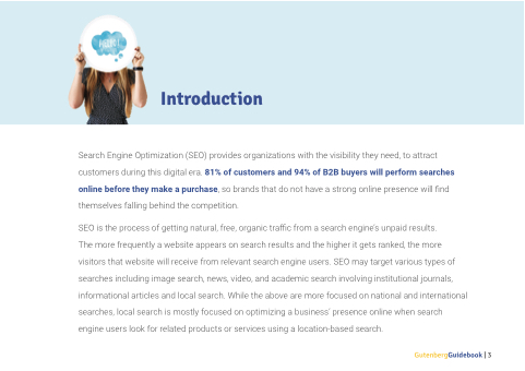may target various types of searches including image search search search news video and academic search search search involving institutional journals informational articles and and local search While the above are more focused on on on on national national and and international searches local search search search is mostly focused on on optimizing a a a a a business’ presence online when search search search engine users look for related products or or services using a a a a a location-based search GutenbergGuidebook | 3