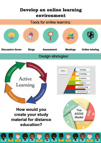 Develop an online learning environment Tools for online learning: Discussion forum Blogs Assessment Meetings Online tutoring Design strategies: How would you create your study material for distance education?