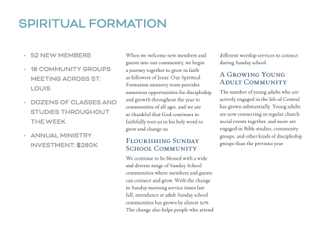 The number of young adults who are actively engaged in the life of Central has grown substantially. Young adults are now connecting in regular church social events together, and more are engaged in Bible studies, community groups, and other kinds of discipleship groups than the previous year.