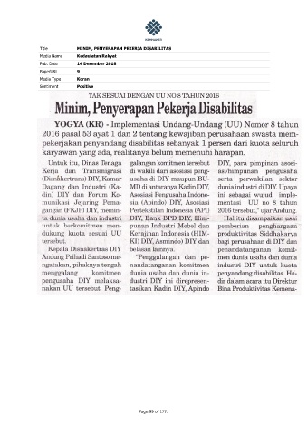 Title MINIM, PENYERAPAN PEKERJA DISABILITAS Media Name Kedaulatan Rakyat Pub. Date 14 Desember 2018 Page/URL 9 Media Type Koran Sentiment Positive Page 99 of 177.