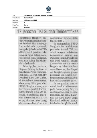Title 17 JENAJAH TKI SUDAH TERIDENTIFIKASI Media Name Harian Terbit Pub. Date 14 Desember 2018 Page/URL 6 Media Type Koran Sentiment Positive Page 139 of 177.