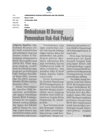Title OMBUDSMAN RI DORONG PEMENUHAN HAK-HAK PEKERJA Media Name Harian Terbit Pub. Date 14 Desember 2018 Page/URL 9 Media Type Koran Sentiment Positive Page 142 of 177.