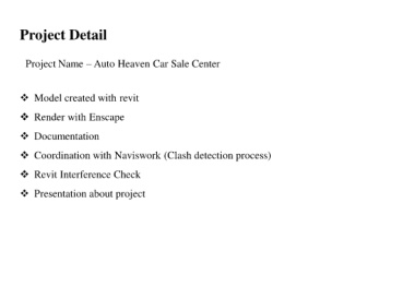Project Detail Project Name – Auto Heaven Car Sale Center ❖ Model created with revit ❖ Render with Enscape ❖ Documentation ❖ Coordination with Naviswork (Clash detection process) ❖ Revit Interference Check ❖ Presentation about project