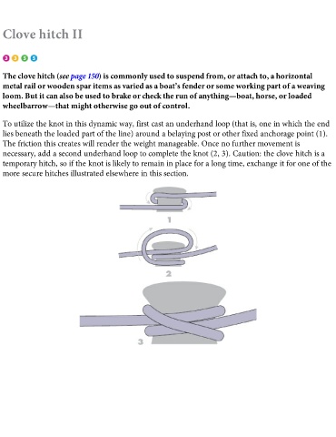 necessary, add a second underhand loop to complete the knot (2, 3). Caution: the clove hitch is a