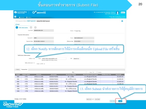 ขั้นตอนการท ารายการ (Submit File) 20 12. เลือก Notifly หากต้องการให้มีการแจ้งเตือนเมื่อ Upload File เสร็จสิ้น 13. เลือก Submit น าส่งรายการให้ผู้อนุมัติรายการ