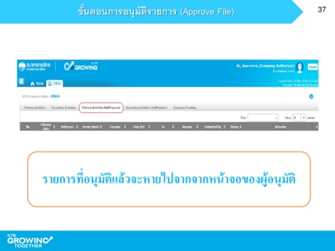 ขั้นตอนการอนุมัติรายการ (Approve File) 37 รำยกำรที่อนุมัติแล้วจะหำยไปจำกจำกหน้ำจอของผู้อนุมัติ