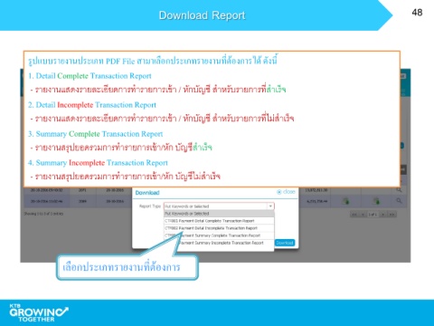 รูปแบบรายงานประเภท PDF File สามาเลือกประเภทรายงานที่ต้องการได้ ดังนี้