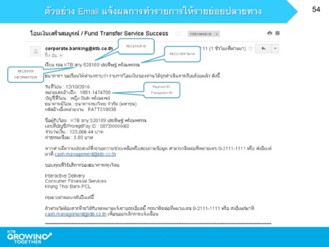 ตัวอย่าง Email แจ้งผลการท ารายการให้รายย่อยปลายทาง 54 RECEIVER ID RECEIVER Name RECEIVER INFORMATION Payment ID- Transaction ID 2