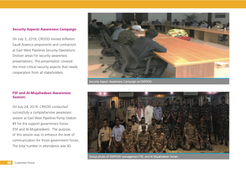 Security Aspects Awareness Campaign On July 3 2019 CRISOD invited different Saudi Aramco proponents and contractors at at East West Pipelines Security Operations Division areas for security awareness presentations The presentation presentation covered the most critical security aspects that needs cooperation from all stakeholders FSF and Al-Mujahedeen Awareness Session: