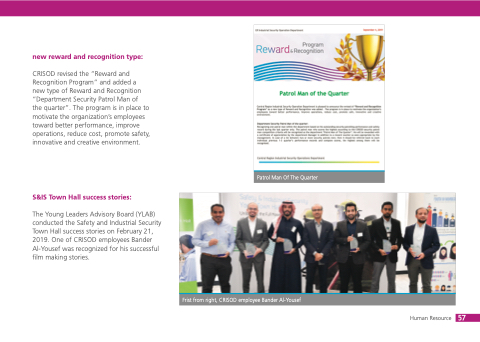 The Young Leaders Advisory Board (YLAB) conducted the Safety and Industrial Security Town Hall success stories on February 21 2019 One of CRISOD employees Bander Al-Yousef was recognized for his successful film making stories Frist from right CRISOD employee Bander Al-Yousef Human Resource