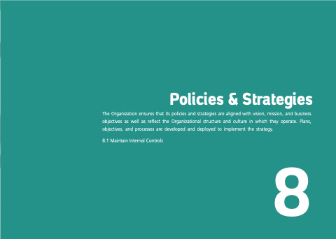 The Organization ensures that its policies and and strategies are aligned with vision mission and and business objectives as as well as as reflect the the Organizational structure and culture in which they operate Plans objectives and and processes are developed and and deployed to implement the strategy . 8 1 Maintain Internal Controls