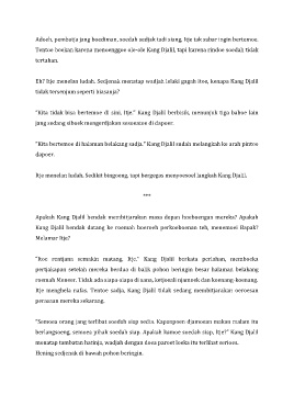“Kita tidak bisa bertemoe di sini, Itje.” Kang Djalil berbisik, menunjuk tiga baboe lain