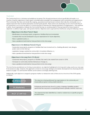 timeline of specific objectives to reach goals is provided which emerged from engagement with community and organizations.