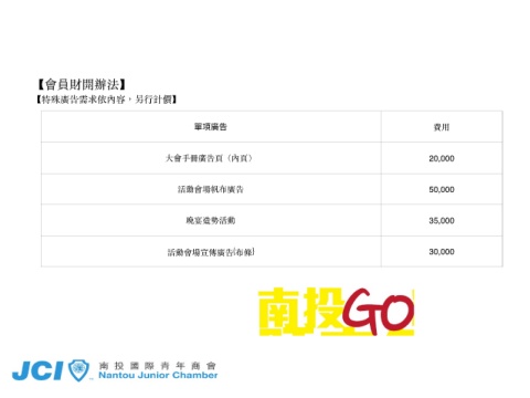 【會員財開辦法】 【特殊廣告需求依內容,另⾏計價】 單項廣告 費⽤ ⼤會⼿冊廣告⾴(內⾴) 20,000 活動會場帆布廣告 50,000 晚宴造勢活動 35,000 活動會場宣傳廣告(布條) 30,000 یҳ ၚ Ըϋึ
