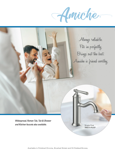Always reliable. Fits in perfectly. Brings out the best. Amiche is friend worthy. Widespread, Roman Tub, Tub & Shower and Kitchen faucets also available. Single Post AM211-PUCP Available in Polished Chrome, Brushed Nickel and Oil Rubbed Bronze.