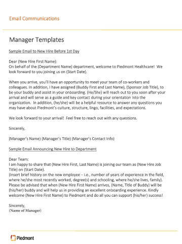 welcome (New Hire First Name) to Piedmont and do all you can support (his/her) success!
