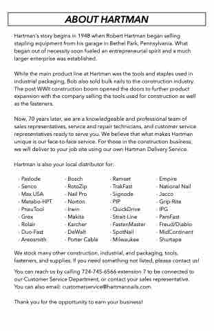 You can reach us by calling 724-745-6566 extension 7 to be connected to our Customer Service Department, or contact your sales representative. You can also email: customerservice@hartmannails.com.