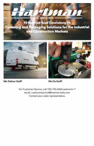 For Customer Service, call 724-745-6566 extension 7 email: customerservice@hartmannails.com Contact your sales representative.