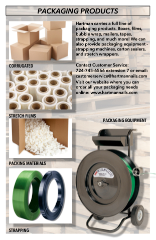 Hartman carries a full line of packaging products. Boxes, films, bubble wrap, mailers, tapes, strapping, and much more! We can also provide packaging equipment - strapping machines, carton sealers, and stretch wrappers.