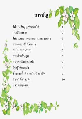 สำรบัญ ไก่เห็นตีนงู งูเห็นนมไก่ 1 กบเลือกนาย 2 ไก่งามเพราะขน คนงามเพราะแต่ง 3 สอนจระเข้ให้ว่ายน ้า 4 กบในกะลาครอบ 5 กระต่ายตื่นตูม 6 หมาเห่าใบตองแห้ง 7 จับปูใส่กระด้ง 8 ช้างตายทั้งตัว เอาใบบัวมาปิด 9 สีซอให้ควายฟัง 10 บรรณานุกรม