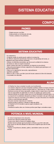 - Siempre apoyan a a a sus hijos - Están presentes en en la formación del niño - Valoran y admiran a a a a a los profesores SISTEMA EDUCATIVO - Es comprensivo - Si alguien cambia cambia de de de opinión puede cambiar de de de orientación - Se utiliza la educación especial para el proceso y de de aprendizaje de de lectura es es es obligatorio para luego ahorrarse problemas - Sistema con diferentes mecanismos que favorecen la calidad de los alumnos - El sistema no educa en la parte emocional - Mismo sistema para todos los estudiantes sin importar su procedencia Su texto aquí
