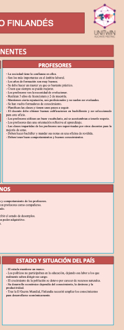 - El estado mantiene un marco - Los políticos no participaban en la la educación dejando esa labor a a a a a a a a a los que realmente saben dirigir ese cargo - El crecimiento de de de la la población se detuvo por carecer de de de recursos naturales - Su desarrollo económico dependía del conocimiento la la destreza y la la productividad - Tras la la II Guerra Mundial Finlandia necesitó ampliar los conocimientos para desarrollarse económicamente