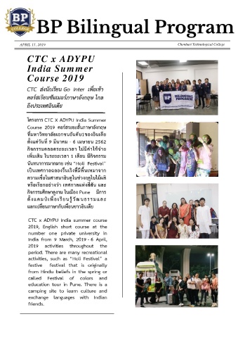 BP Bilin gu al Pr ogr am APRIL 15, 2019 Chonburi Technological College CTC x ADYPU I ndia Summer Course 2019
